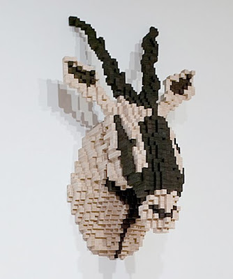 Game heads, birds, fish, other animals and fire are just a few of the subjects of Shawn Smith's contemporary artwork. But unlike the many artists who choose to interpret these same items in realistic or impressionistic manners, artist Shawn Smith chooses to take them a step further. He combines the digital world with the real world by constructing his sculptures of wood blocks, creating three dimensional pixelated representations of animals and nature.